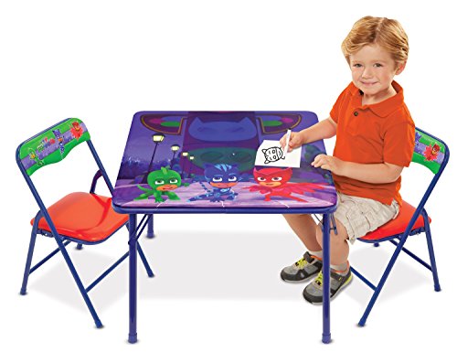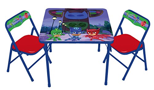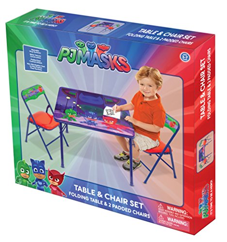 ReleaseDate : 2017-06-01 Studio : Moose Mountain - Domestic Publisher : Moose Mountain - Domestic Binding : Toy Product Description Now your child can have hours of fun with this PJ Masks superhero team activity table set. The set comes with 1 24"x24" table 2 padded chairs. Bright colorful graphics large table surface for drawing, eating playing. Vinyl surface is washable. Made of sturdy metal tubular construction. Adult assembly required, tool included. Chairs include a safety locking mechanism. Chairs have a recommended weight limit of 70 lbs. Designed for ages 3 0