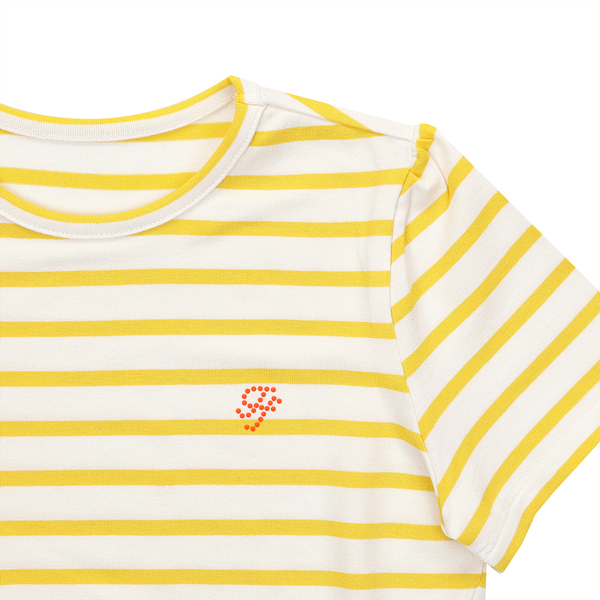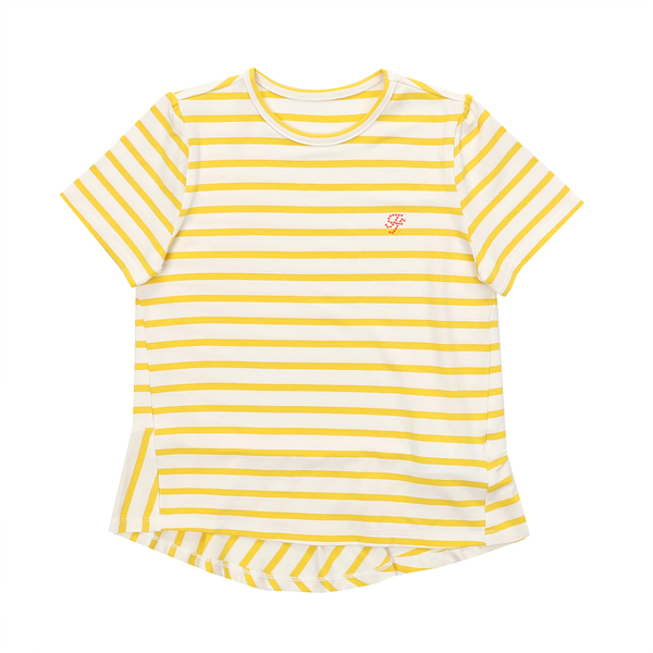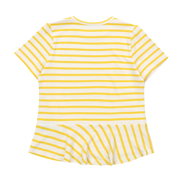 화이트컬러에 엘로우스트라이프가 배색이 되어 산뜻한 느낌으로 코디되는 상품입니다.