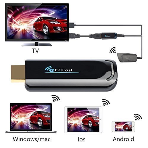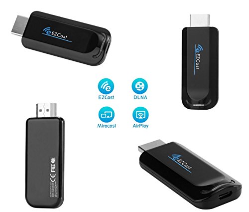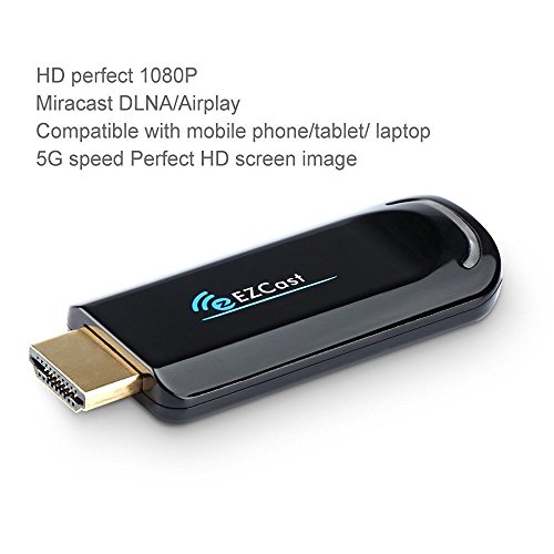 -. Binding : Electronics -. Brand : EZCast -. EAN : 0641945148343 -. Feature : 1. It is a dongle with HDMI output, users can cast pictures,music,videos of ios/mac os/android/windows device to the big screen by using EZCast function.Achieve Miracast wireless sharing feature on your mobile screen directly mirrored to the TV screen or projector .enables wireless delivery of streaming or local HD movie/picture/screen from windows pc, tablets, mobile phones, etc to normal TV set. / 2. Multi-Standard support: Miracast, DLNA, Airplay.Multi-Platform support: Windows MacOS PC/Notebook, Android phones/tablet.Can directly play local video/music, support mirroring.Cast Content: Video, photo, game, files. / 3. Extended cable with WiFi dongle to avoid big TV screen blocking wireless signal.Display Device: HDTV or projector with HDMI port.Simple installation; Easy handling and configuration - just follow the instructions shown on the start.screen on TV. / 4. H.264 1080P full HD video decode, Resolution 1080p Full HD, can be switched to 720p if your TV does not support.LPCM Audio Decode.Flexible power using TV standard USB port (no less than 400mA) or external USB power supply (not included).Firmware, APPs, PC software all are upgraded regularly. / 5. Supports the DLNA protocol, the mobile phone, tablet PC, notebook computer content ipush to the TV and projector player.Support Miracast protocol, mobile phone, tablet computer,notebook computer and television, projector and other large screen displayed in the same screen.The most interesting features, mobile phones as game controllers.(This feature need your phone have android 4.2 system) -. Label : EZCast -. Manufacturer : EZCast -. PackageQuantity : 1 -. ProductGroup : PC Accessory -. ProductTypeName : COMPUTER_ADD_ON -. Publisher : EZCast -. Studio : EZCast -. Title : EZCast 5G TV Dongle 1080p Miracast DLNA Airplay WiFi High Speed Wireless HDMI Display Receiver Supports 5G WiFi Compatible with iOS Android Windows Device -. UPC : 641945148343