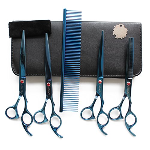 Function introduction Straight scissor for cutting hair,mainly used for pet hair flat parts. Thinning scissor for thinning the pet's fur,let the fur after pruning more natural and beautiful. The tooth comb blade is good for fine or coarse fur. Curved scissors is an essential tool, use for trim your pet's eyelashes, nose, face, ears, belly, hips, etc. Please put the curved scissors in original case after use.
