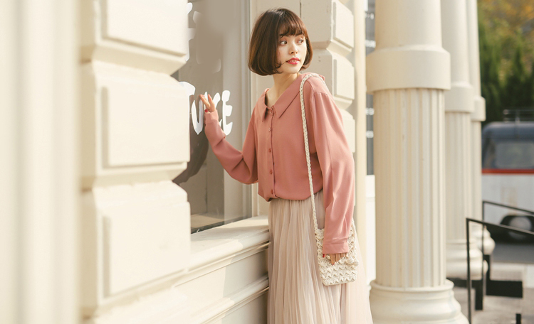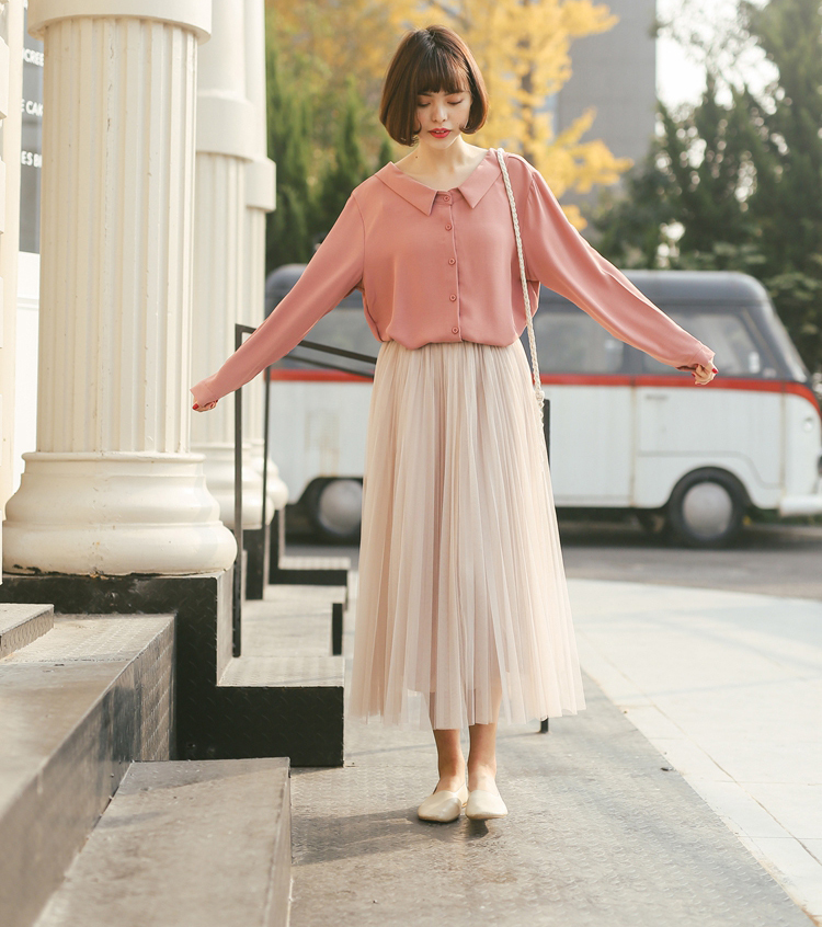 春色カラーが女性らしく、チュールが華やかな印象のロング丈プリーツスカートです。
