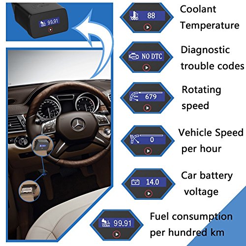 -. Feature : EXCELLENT COMPATIBILITY: Works on all 1996 and newer vehicles ,light trucks sold in the United States(OBD2), includes all Domestic, Asian and European vehicles. Supports OBD-II protocols:SAE J1850 PWM,SAE J1850 VPW,ISO 9141-2,ISO14230-4 KWP (5 baud init),ISO14230-4 KWP (fast init),ISO15765-4 CAN (11bit, 500 Kbaud),ISO15765-4 CAN (11bit, 250 Kbaud),ISO15765-4 CAN (29bit, 250 Kbaud),SAE J1939 CAN (29 bit, 250 Kbaud). / HIGH UNIVERSALITY: Using Upgrade Bluetooth dual-mode design (2.0/4.0), perfectly support IOS, Android and Windows Device.Unique obd2 bluetooth ios for iphone user / SMART SCANNING: Read diagnostic trouble codes( both generic and manufacturer-specific),Clear trouble codes and turn off the MIL, Display current sensor data,including Engine RPM, Calculated Load Value, Coolant Temperature, Fuel System Status, Vehicle Speed, Short Term Fuel Trim, Long Term Fuel Trim, Intake Manifold Pressure, Timing advance, Intake Air Temperature, Oxygen sensor voltages/associated short term fuel trims, Fuel System status, Fuel Pressure.AND Many others... / WITH LCD DISPLAY: This Scanner adapter with a LCD display. You can display 6 items without connecting your phone, including -- Diagnostic trouble codes, Vehicle Speed per hour, Rotating speed, Fuel consumption per hundred km , Coolant Temperature, Car battery voltage. / EASY TO OPERATE: Just need to connect OBD2 Scanner with your phone Bluetooth via our free app, and you can diagnose any car problem and unlock massive amounts of data on your car's performance in real time.
