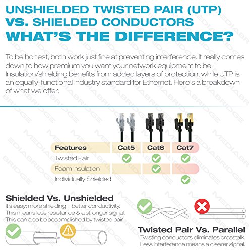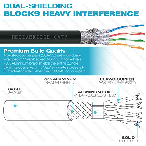 GOODBYE INTERFERENCE: 4 twisted copper pairs (26AWG) are individually wrapped in Mylar-backed Aluminum foil, while a 70% Aluminum braid shields the entire bundle. Given its dual-shielding, Cat7 eliminates crosstalk & interference far better than its Cat6 counterpart.