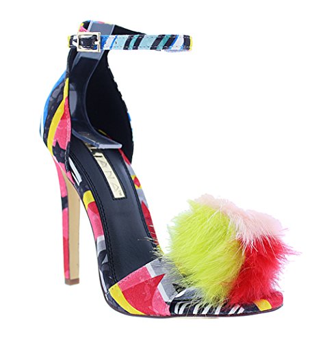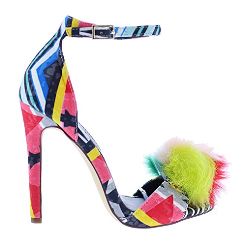 Product DescriptionThis lovely?heel?features an?open toe?with colorblock pompom accent, geometric print flannel fabric, buckled ankle strap, and wrapped stiletto heel. Finished with a lightly padded insole.0