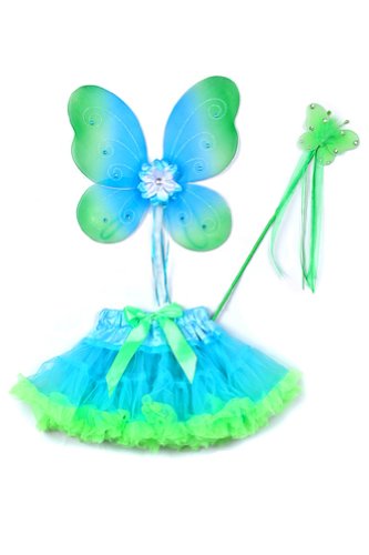-. Feature : 3-Piece Wings, Tutu, & Wand. Fits Toddler Girls Approximately 2-5 years / Two-toned Aqua Blue & Lime Green Butterfly Wings with Silver Glitter and Rhinestone Flower Ribbon Center / Aqua Super Soft Tulle Tutu w/Soft Waistband and Satin Ribbon Bow / High Quality Tutu Edged with Lime Green Tulle / Matching Lime Green Butterfly Rhinestone Wing Fur and Ribbon Wand