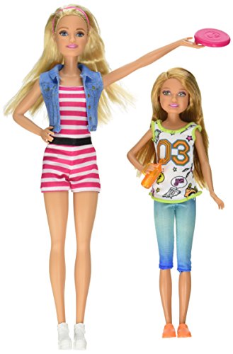 -. Feature : Two Barbie sister dolls together in one pack double the family fun! / Barbie and Stacie dolls are ready to play outdoors / Accessories include a throwing disc and water bottle for an active day in the park / Barbie doll looks casually cool in a red and white striped jumpsuit, denim vest and white kicks / Skipper doll is sporty chic in a team tank, blue leggings and bright sneakers