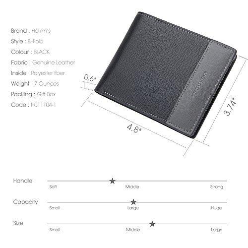 -. Binding : Apparel -. Brand : Harrms -. ClothingSize : One Size -. Color : Black-Split Joint-Classic Style -. Department : mens -. EAN : 0601629571911 -. Feature : Perfect Front Pocket wallet to carry some money ID and a few cards,Top quality! / Design is USA,Tough stitching.Hand Made by professional artisans.a beautifully crafted wallet that will only get better with age. / 100% Italian Cowhide leather . Gift packaging, the best gift of choice. / We know you'll love our wallet, that's why if you aren't 100% satisfied we will provide you with a refund or a free replacement - which ever you prefer. Buy more for your friends and family. / Dimensions = 4.8" 3.74" 0.6".Two bill compartment, Four credit card slots, and One leather-framed ID window. -. PackageQuantity : 1 -. ProductGroup : Apparel -. ProductTypeName : ACCESSORY -. Size : One Size -. Title : Harrm's Best Mens Handmade Genuine Leather with Designer,thin Bifold Wallet Italian 100% Cowhide Style Luxury -. UPC : 601629571911