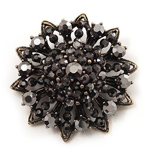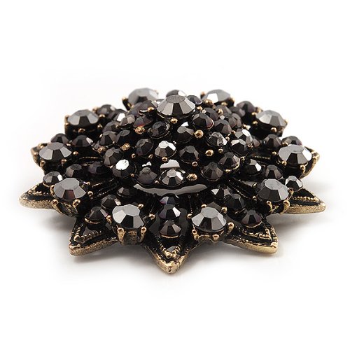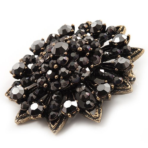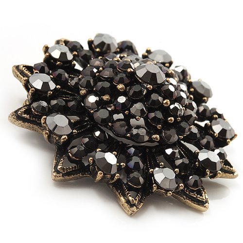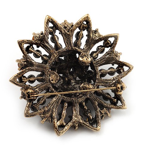 -. Title : Black Crystal Dimensional Floral Corsage Brooch (Antique Gold Tone)