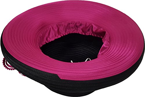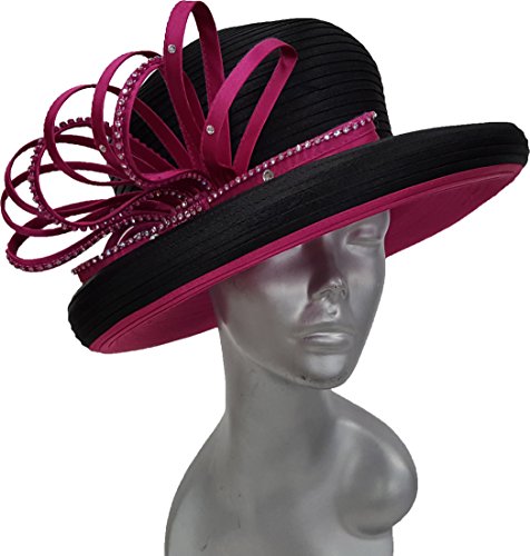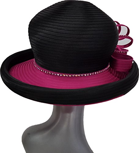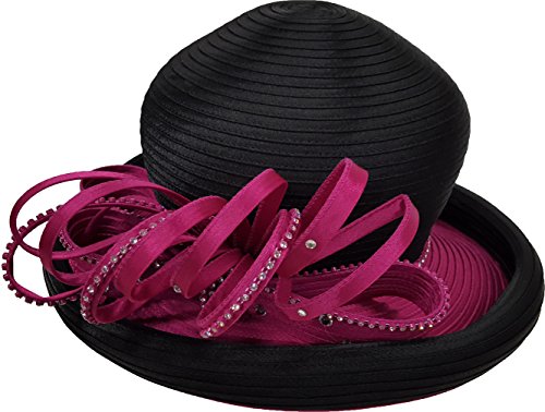 Binding : Apparel Product Description WOMEN'S FASHION/ DESIGNER COUTURE, DRESS, CHURCH, (ALL YEAR-AROUND) SATIN RIBBON HAT This magnificent and bright colored couture satin ribbon hat is a 2 tone black/Fuchsia color. The rounded crown and rolled medium size up brim makes it truly unique! The hat is trimmed with matching rows of crystal rhinestones. The hat has an adjustable sweatband to fit almost any head size and the satin ribbon makes this a hat that can be worn all year around 0