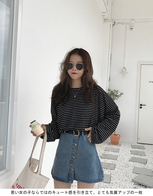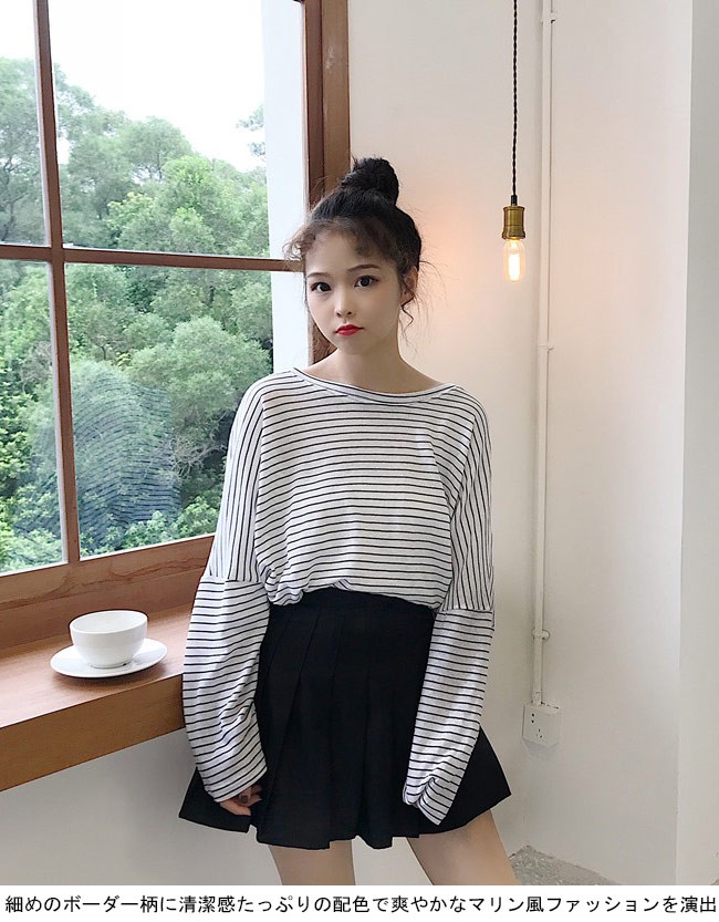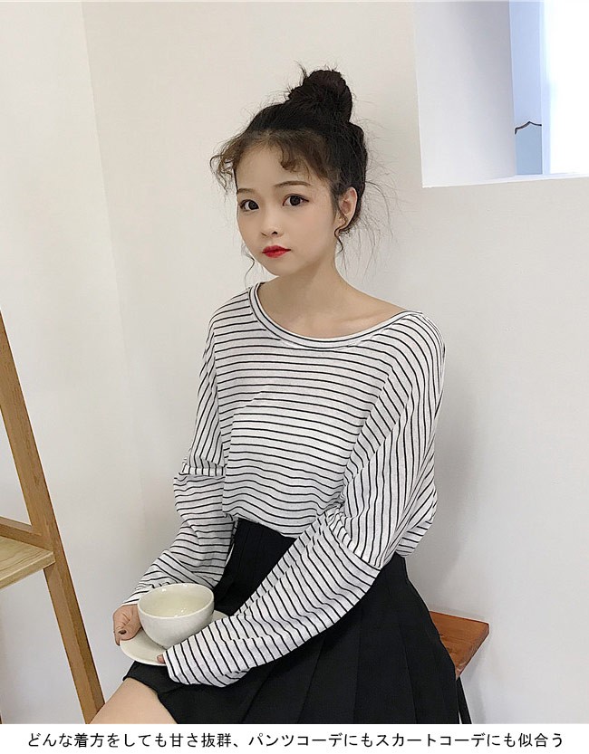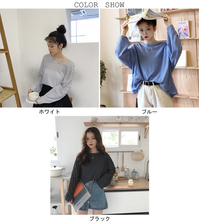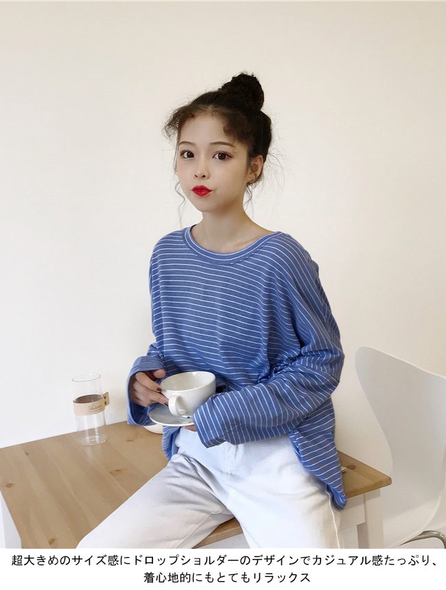 長袖Tシャツ レディース ボーダー柄 Tシャツ ゆったり マリンセーラー 丸襟 女性用 トップス カットソー カジュアル ドロップショルダーレディース用の長袖Tシャツが登場超大きめのサイズ感にドロップショルダーのデザインでカジュアル感たっぷり、着心地的にもとてもリラックス細めのボーダー柄に清潔感たっぷりの配色で爽やかなマリン風ファッションを演出どんな着方をしても甘さ抜群、パンツコーデにもスカートコーデにも似合う若い女の子ならではのキュート感を引き立て、とても気質アップの一枚カラー:ホワイト ブルー ブラック素材 ポリエステルサイズ(cm) FF 着丈54 バスト134ご注意:※サイズは平置きサイズです。素人採寸ですので、若干の誤差がございます、ご了承ください。