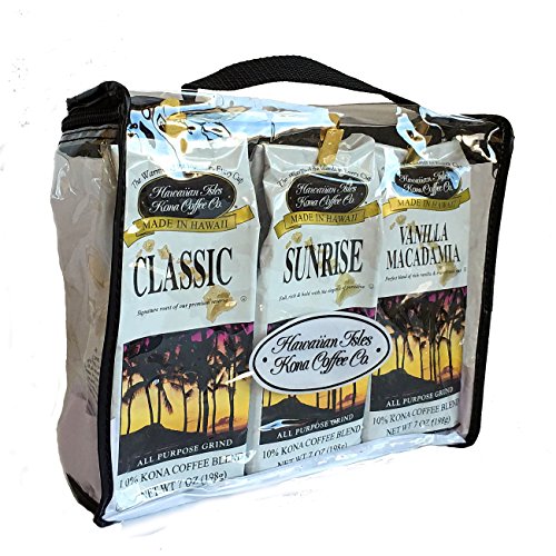 This gourmet coffee gift will be a hit for coffee lovers to make the most anticipated morning of the year even more exciting with this delicious, aromatic and so indescribably satisfying Hawaiian Kona Coffee! Each plastic Tote has a black trim handle with zipper. These make popular special gifts and contain 3 (7 oz.) bags of delicious 10%Kona ground coffee. One bag of each of the following flavors: Kona Classic, Kona Sunrise, and Kona Vanilla Macadamia. Hawaiian Isles Kona coffee blends uses Kona Coffee beans grown on the Big Island's Kona Coast where nature's elements combine to form perfect coffee growing conditions throughout the year. We blend this rich coffee with the finest arabica beans from around the world to bring you a truly unique gourmet taste. Our flavored coffee contains no gluten and is Kosher certified. Click the "Add to Cart" button to order yours NOW while supplies last!Feature