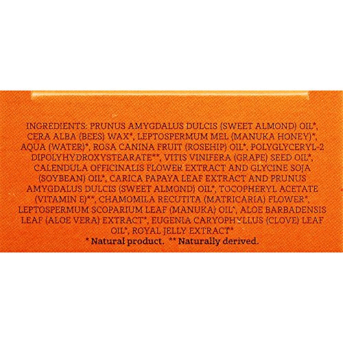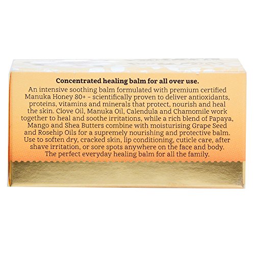 -. Feature : An intensive soothing balm with premium manuka honey / Delivers antioxidants, proteins, vitamins and minerals that protect and nourish your skin / With clove oil, manuka oil, calendula and chamomile which work together to heal / Also contains grape seed and rosehip oils / Use to soften dry and cracked skin, condition lips, soften cuticles, and calm insect bites