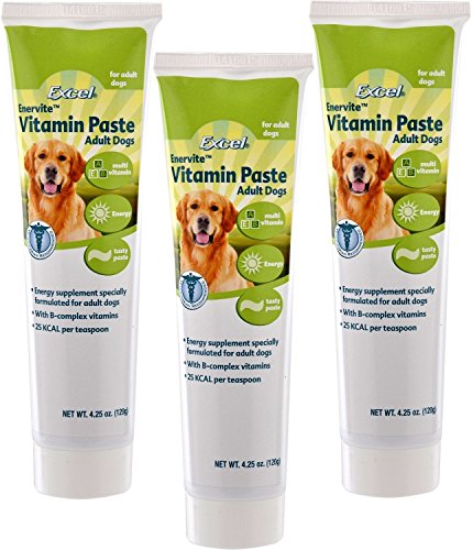 -. Feature : Pack of 3 Excel Enervite Daily Supplement Vitamin Paste, 4.25-Ounce Each / Provides essential vitamins and minerals required by adult dogs / With B-Complex vitamins / High calorie, high energy nutritional paste supplement. / Specially formulated for extra-active adult dogs, dogs off their normal diet, and pregnant dogs.