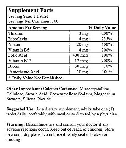 Vitamin B Complex consists of several Vitamin B's that work well together to support energy metabolism and nervous system health. Each nutrient in the B Complex performs a unique role in maintaining proper metabolic functioning. Furthermore, B Vitamins are precursors of coenzymes involved in the conversion of cellular energy. They manufacture hormones and proteins and help maintain nerve structures. B Complex vitamins may also help maintain the health of nerves, eyes, skin and hair.†These statements have not been evaluated by the Food and Drug Administration. This product is not intended to diagnose, treat, cure or prevent any disease. Keep out of the reach of children. Store in a cool dry place, tightly closed.