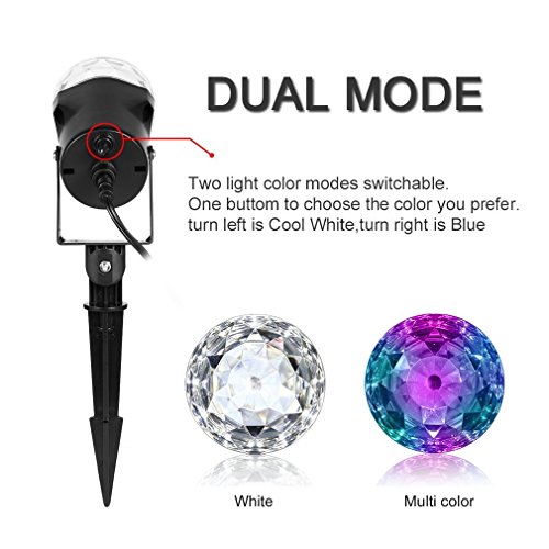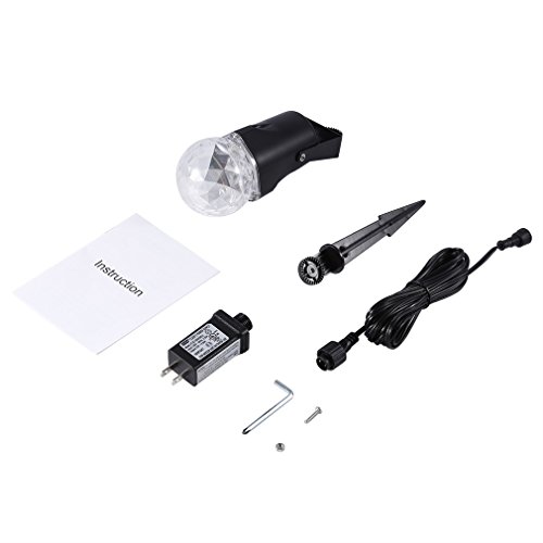- 🏃 [Long Lifespan]: Different from other laser lightings with short lifespan. Multi Color + White(1pc red LED, 1pc green LED, 1pc blue LED, 3pcs white LEDs) switchable kaleidoscope spotlight can be used at least 50000 hours. Durable ABS plastic housing, IP44 waterproof level, no worry about the use security. It can be used outdoor to decorate house, trees, pond, pool and concerts etc, and also for indoor to decorate KTV, family party and christmas party and other holiday activities.