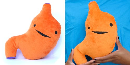 This is the SUPER STOMACH Designer Plush Figure - I Ache For You! from the I Heart Guts Series. Comes with an informative booklet-style hangtag describing the magic of this wonderful organ. Safe for all ages!! "This awesomely orange 10" x 6" x 3.5" giant tummy is so cute you'll want to eat him up. The stomach creates a highly acidic environment used to digest all the cookies, ice cream and bacon you gobble up. This lil' guy's digestive juices help break down food for the intestine, which absorbs the actual nutrients. Don't forget to chew!!"Feature