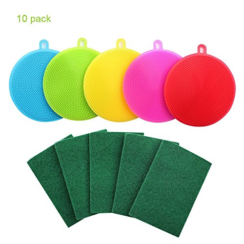 Vinchou 5 Pack Antibacterial Silicone Sponge Scrubber Dishwashing Cleaning Brush and 5 Scouring Pads for Bonus, Fruit and Vegetable Washer Heat Insulation Pad For Kitchen Wash Pot Pan Dish Bowl