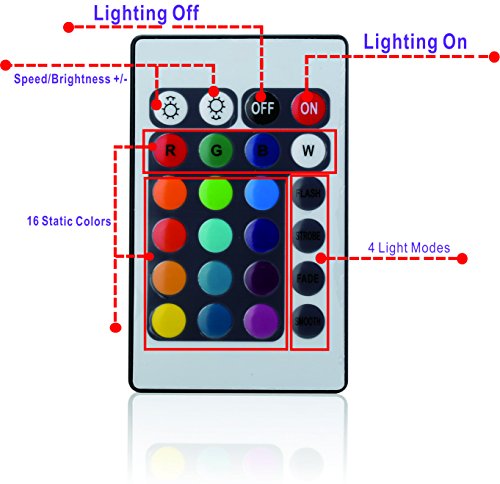-16 different static colors, you can press color buttons directly to select single static color for the lights, such as White (W), Red (R), Green (G), Blue (B) and other mixed colors.