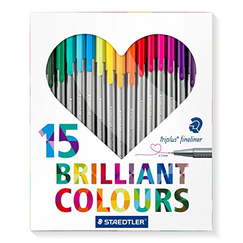 -. Feature : Triplus Fineliner Pens for adult-coloring books and more, 15-Piece Brilliant Color Pen-Set, Staedtler: packaged in a box with see-through heart shape making it very suitable for gift-giving. / Acid-free ink doesn't dry out. The ink in these unique pens is specially formulated to flow smoothly and avoid drying out, even when the cap is left off for up to 14 days. And the porous tip helps draw ink onto the paper for sharp, skip-free lines. / Point allows for precise strokes. The super-fine metal-clad tip is perfect for those occasions when you need to put down crisp, clean, precise lines, or when you need to write small because space is limited. / Triangular barrel makes writing effortless. The barrel's unusual triangular shape helps you grasp the pen more comfortably and exercise more control for hours of fatigue-free writing. And because it's triangular, this nonrefillable pen is less likely to roll away from you when you lay it down. A handy pocket clip makes it easy to tote hands-free. / 0.3mm fineliner point allows for precise strokes.