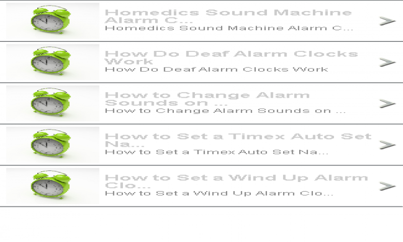 - Feature : Alarm Clock Sound / In this App you can see this topic. / 1. Homedics Sound Machine Alarm Clock Instructions / 2. How Do Deaf Alarm Clocks Work / 3. How to Change Alarm Sounds on a Droid / 4. How to Set a Timex Auto Set Nature Sounds Alarm Clock / 5. How to Set a Wind Up Alarm Clock / And you can see the Video and Game / keyword : Alarm Clock Sound