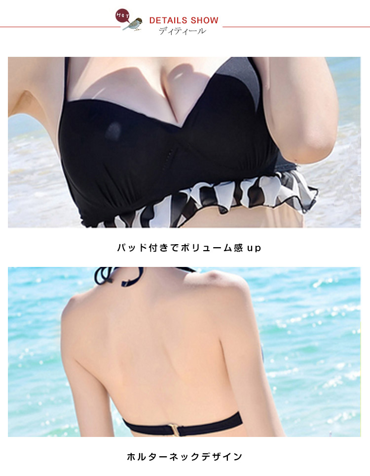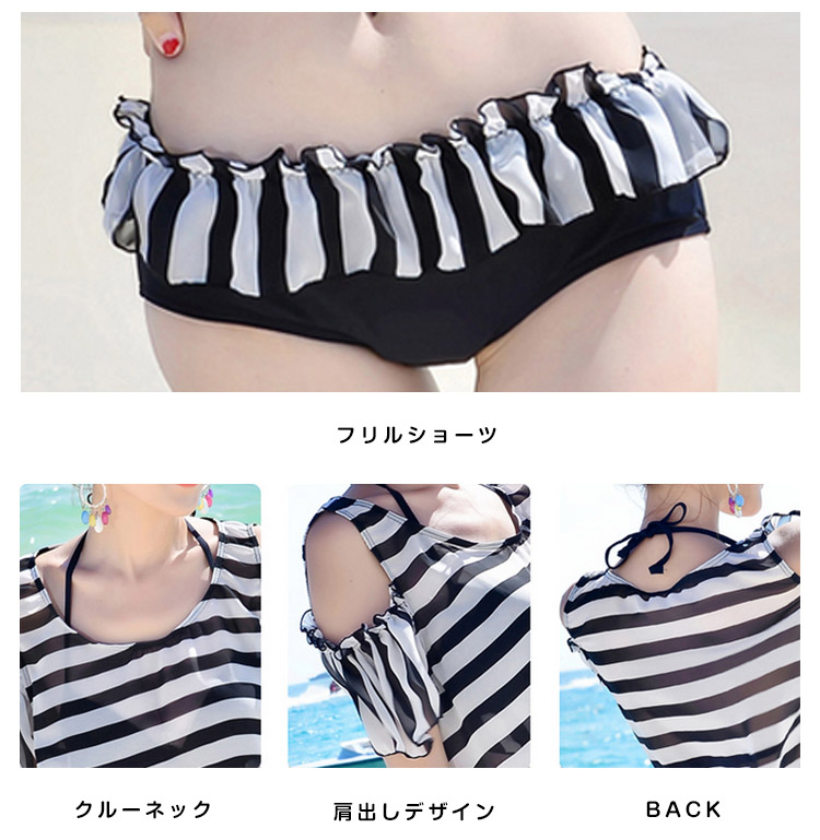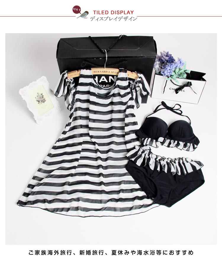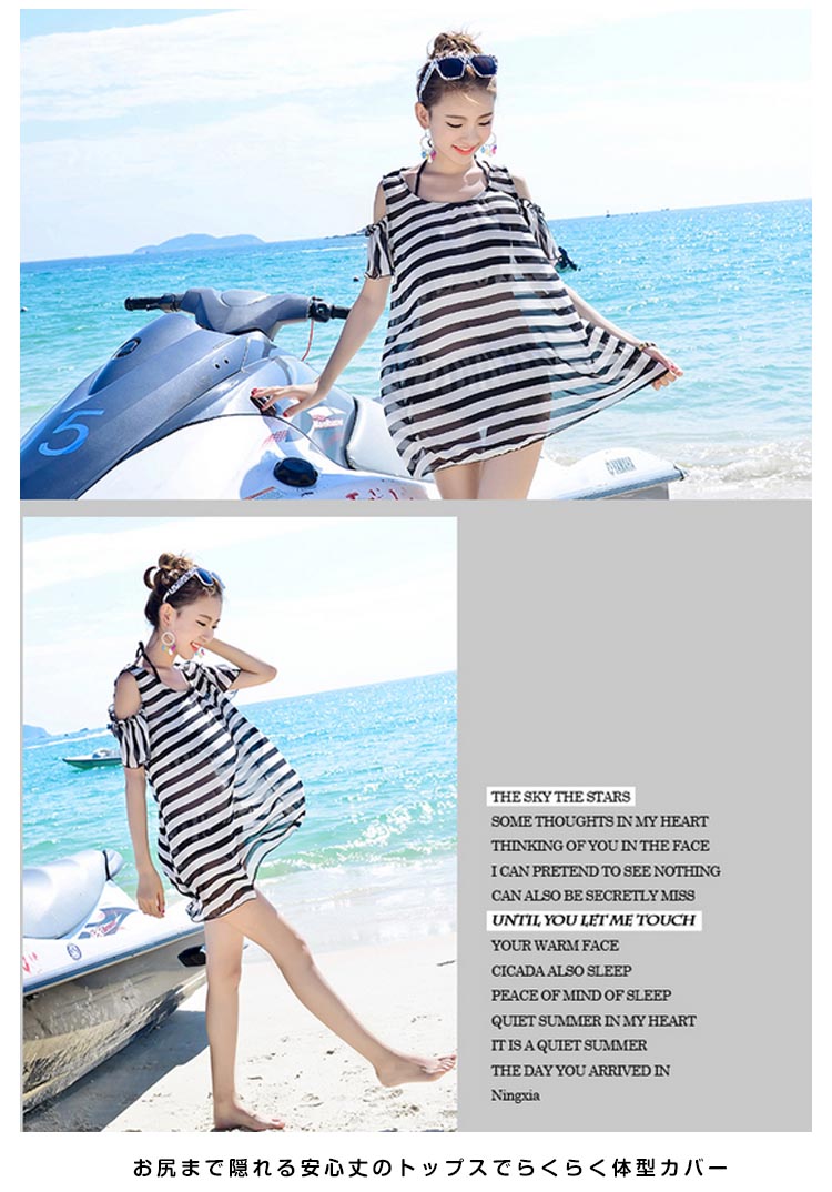 | かわいいボーダー柄トップスがついた3点セットレディース水着お尻まで隠れる安心丈のトップスでらくらく体型カバー可愛くてセクシーな水着でビーチの男子諸君の視線をGETご家族海外旅行、新婚旅行、夏休みや海水浴等におすすめ | |