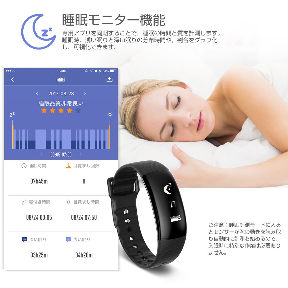 We measure the time and quality of sleep by synchronizing the dedicated application.