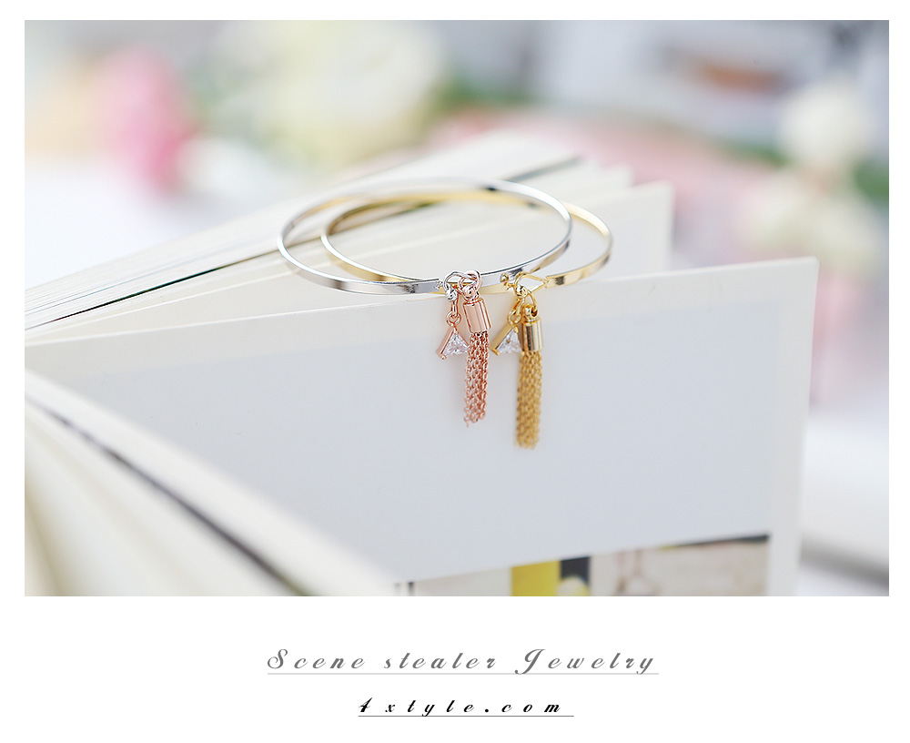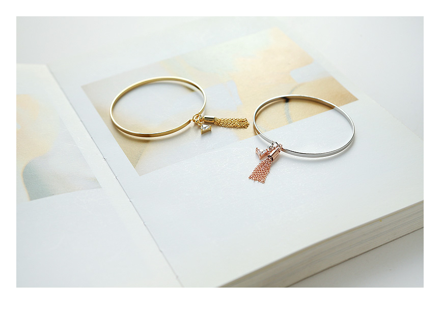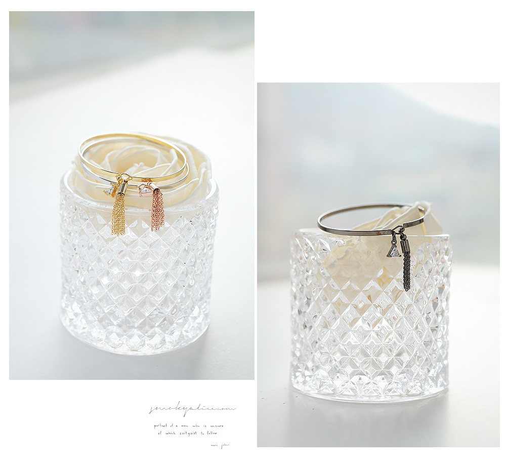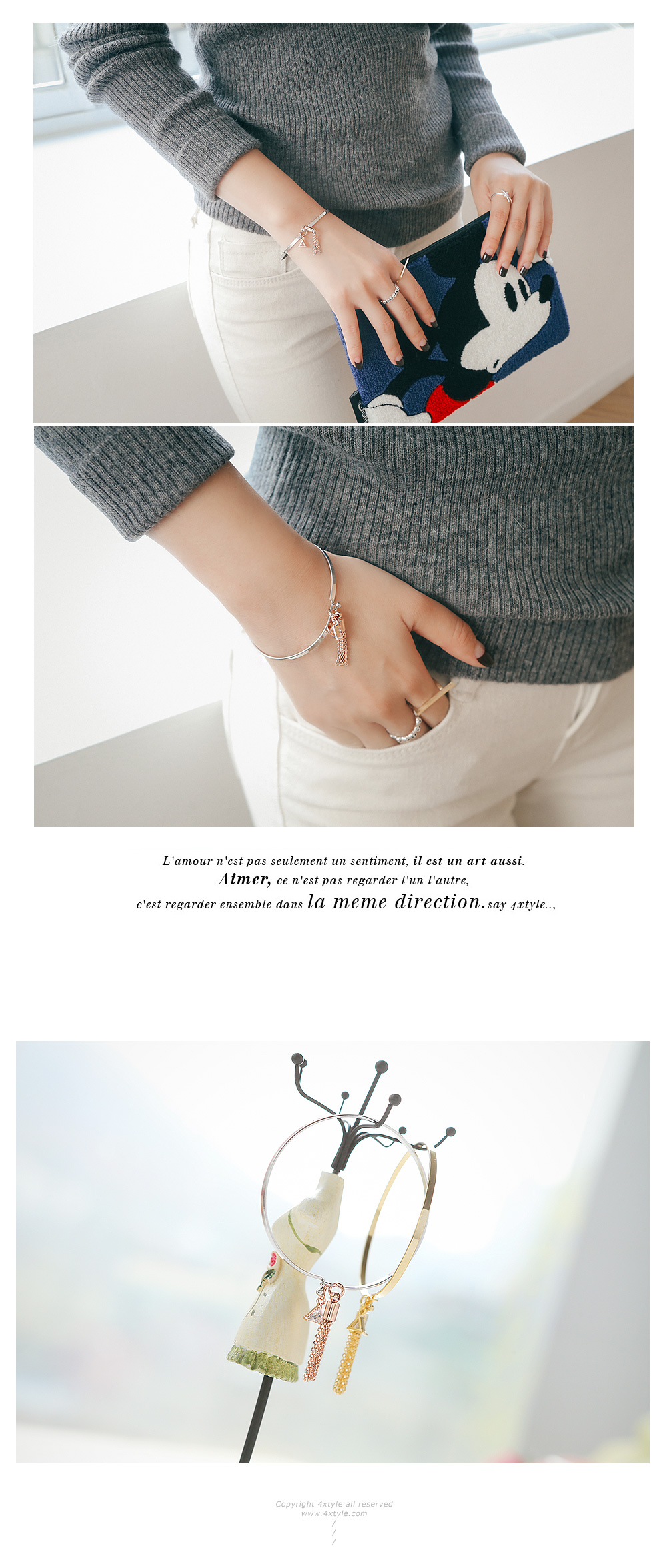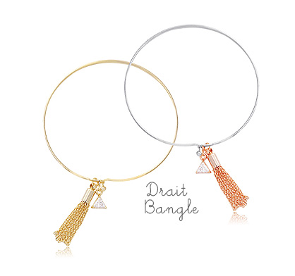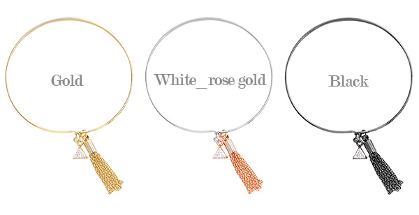 삼각의 반짝이는 큐빅 장식과 메탈 태슬이 트랜디 하면서도 시크함이 묻어나는 디라잇 뱅글 팔찌 입니다. 슬림한 라인과 깔끔한 컷팅이 매력적인 아이템으로 어느 스타일에나 매치가 가능한 소장가치 충분한 아이예요. 훅장식이 앞에 있는 디자인으로 착용하기 편하며 큐빅장식은 물림으로 셋팅되어 고급스러운 팔찌랍니다. 모던한 감성을 완성해주는 디라잇 뱅글 팔찌!