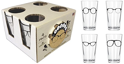 Product Description Glasses Pint Pack includes 4 Pint Glasses with 6 matching cork coasters. 100% Made in the USA. Includes matching coaster set. Standard 16 ounce pub pint glass. 0