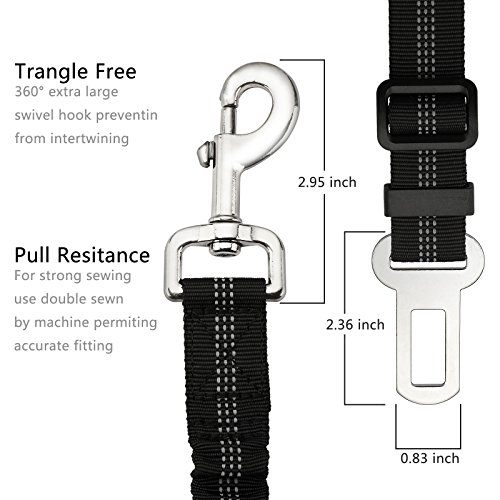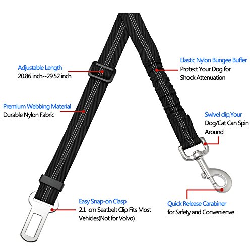 -. Binding : Misc. -. Brand : Doopa -. Feature : SAFETY GUARANTEE - Keep your pets away from driver's seat for your pets' and your safety. / PROTECTION - Flexible nylon fabric bungee with buffer damping design could protect your dog from sudden brake and turns. / EASY TO USE - Attach the hook end to the dog harness' ring, and plug the opposite end of the dog seat belt into your car's seat belt receptacle. / LENGTH ADJUSTABLE - The length of strap can adjust from 20 to 30 inch, allows your dog to sit, stand or lie down comfortably in a car. / DURABILITY - The belt is made of the sturdiest and strongest nylon fabric to ensure safety and comfort for your pet. The zinc alloy swivel snap and metal buckle enhance durability. -. Label : Doopa -. Manufacturer : Doopa -. PackageQuantity : 1 -. ProductGroup : Pet Products -. ProductTypeName : PET_SUPPLIES -. Publisher : Doopa -. Studio : Doopa -. Title : Dog Cat Pet Car Safety Seat Belt Harness Restraint Lead Adjustable Travel Collar with Elastic Nylon Bungee - 2 Pack