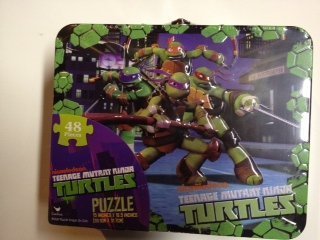 Product DescriptionTMNT 48 piece puzzle game with lunchbox type metal tin Puzzle measures 15"by 12.5" Tin measures 7.5" by 6.5" by 3"0