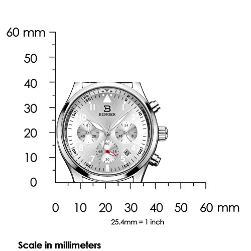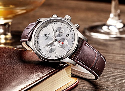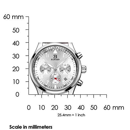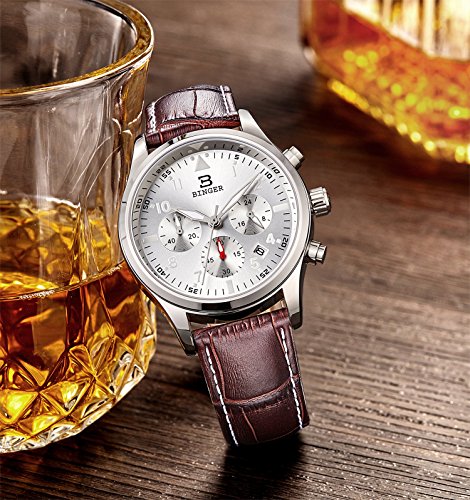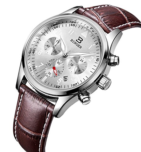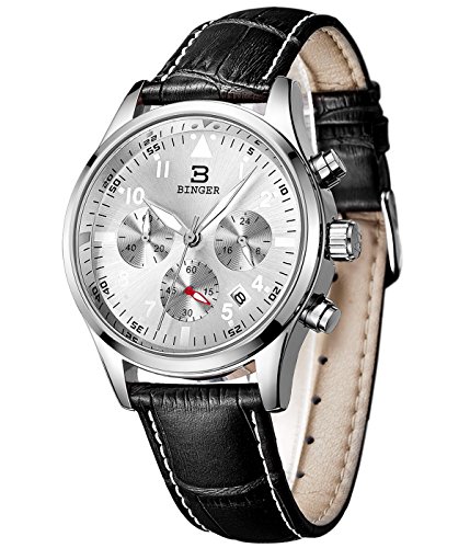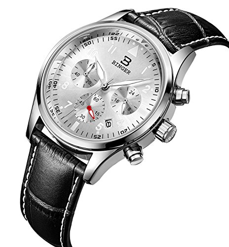 -. Title : BINGER 腕時計 メンズ ブラック本革バンド シルバー文字盤 シルバーケース 日付表示 三つの独立小さい文字盤 防水 9202B-P01AY