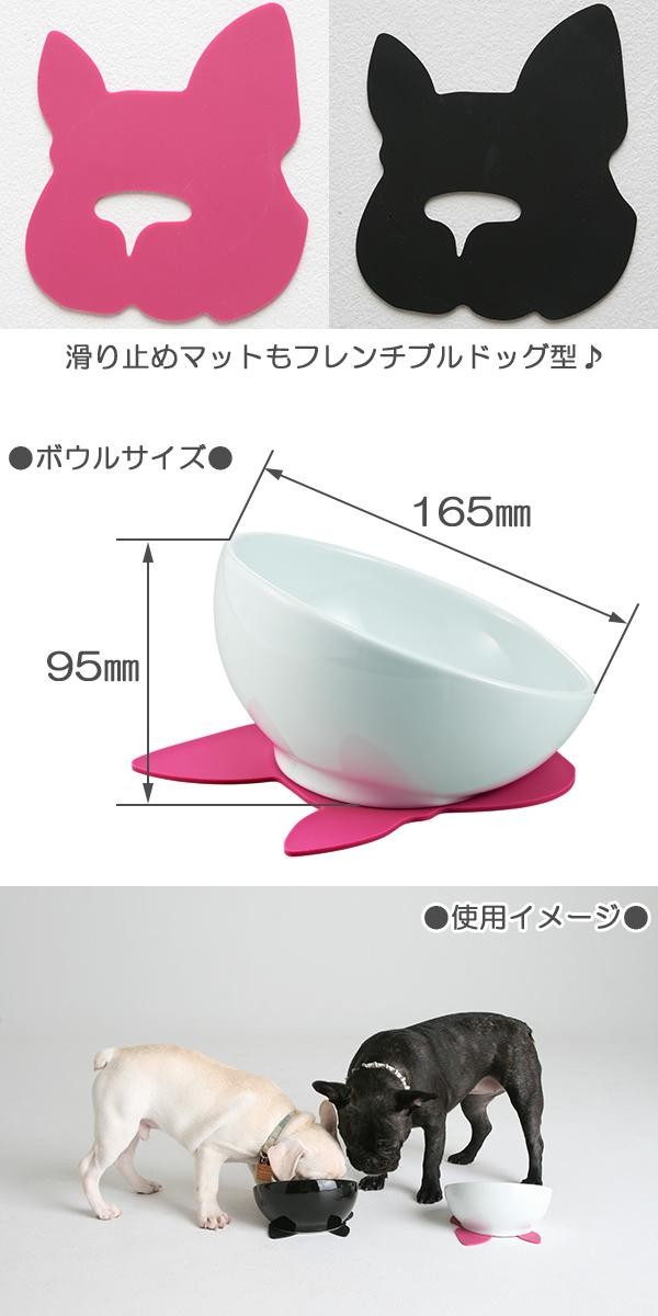| フレンチブルドッグ専門誌「BUHI」と共同研究を重ね辿り着いた形状です。フレンチブルドッグの顔がスッポリと入る大きさを確保しながら安定感も出しました。部屋を汚さないために「そり返し」をつけてフードがこぼれにくいように設計してあります。滑り止めマットもフレンチブルドッグ型です。 |