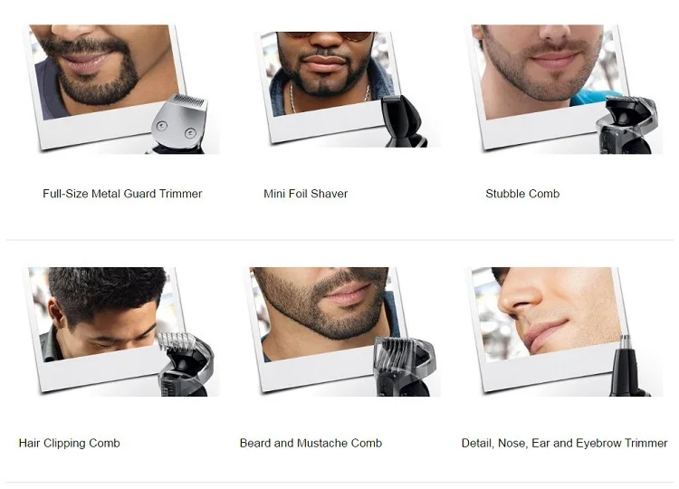 Package Contents: 1 x Shaver, 1 x Hair Clipper, 1 x Comb1, 1 x Comb2, 1 x Nose Trimmer, 1 x Temple Trimmer, 1 x Power Cord, 1 x Cloth Bag