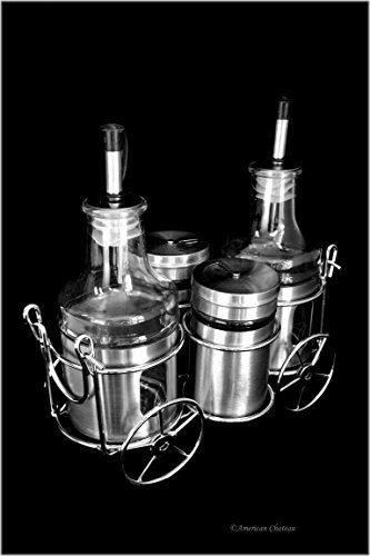 -. Feature : Modern Cruet Set with S&P Shakers / Chrome Wagon Style Cart Caddy / Glass Bottles with Stainless Steel Sleeves / Giftox / Approximate Size: Overall: 8"Lx4.5"Wx7.5"H, Bottles: 8oz, Shakers: 2"Hx3.25"Diameter