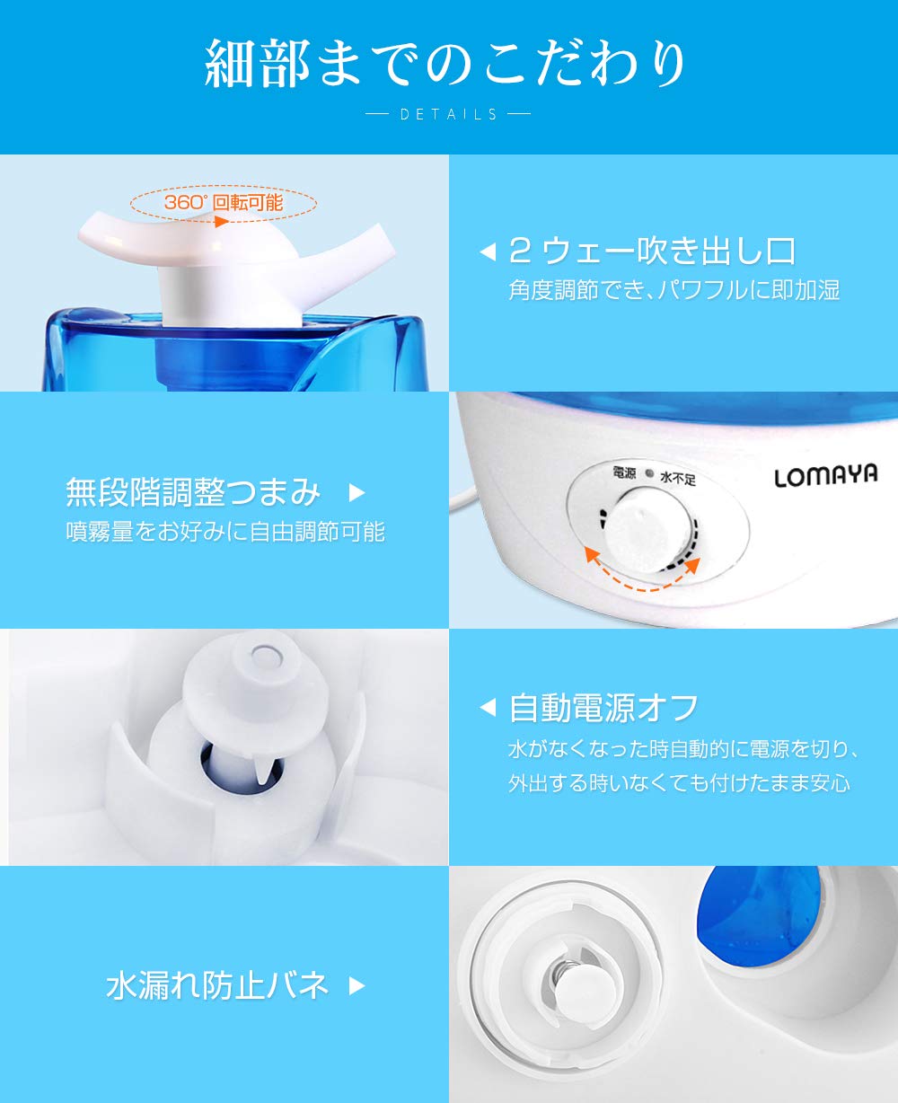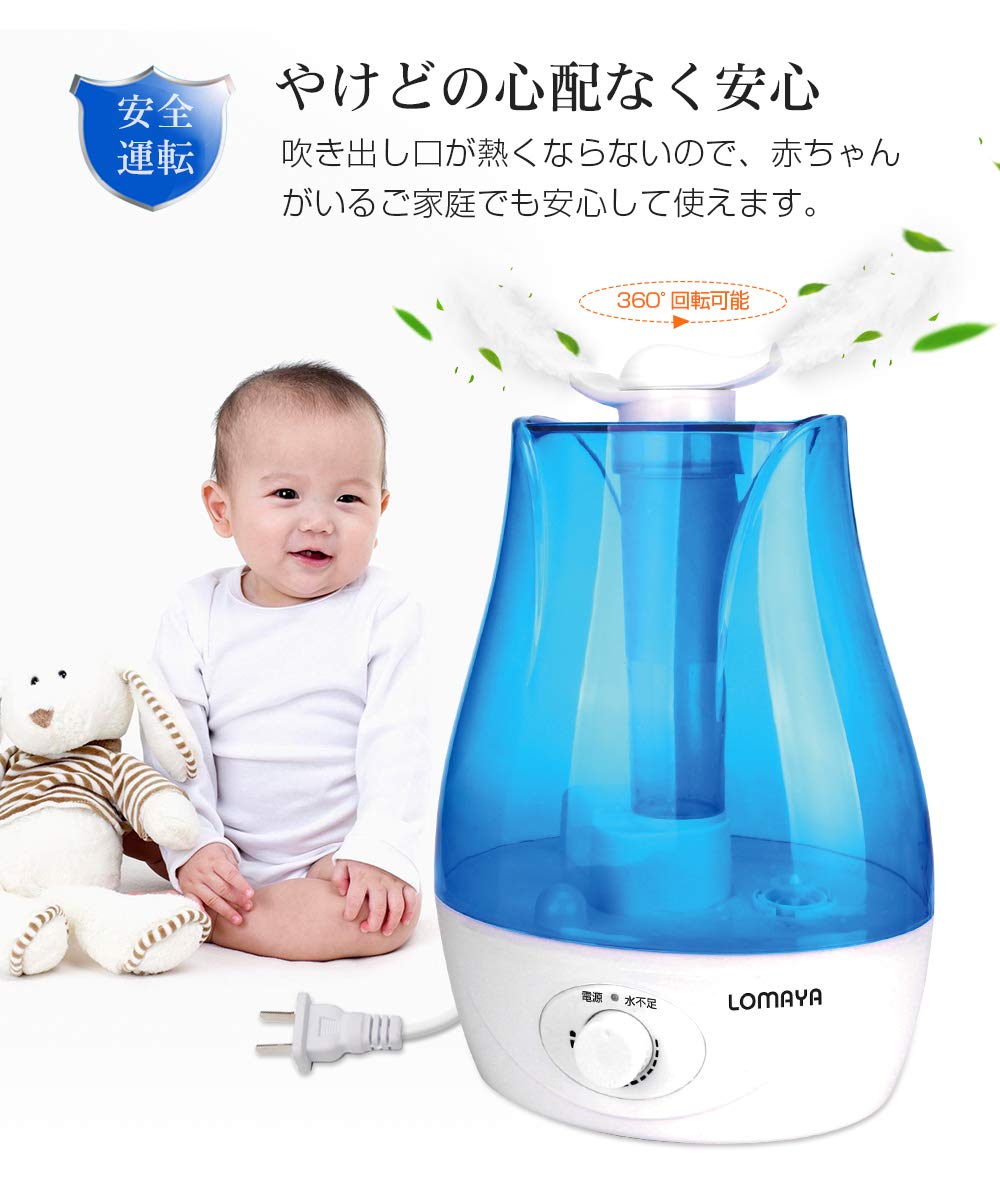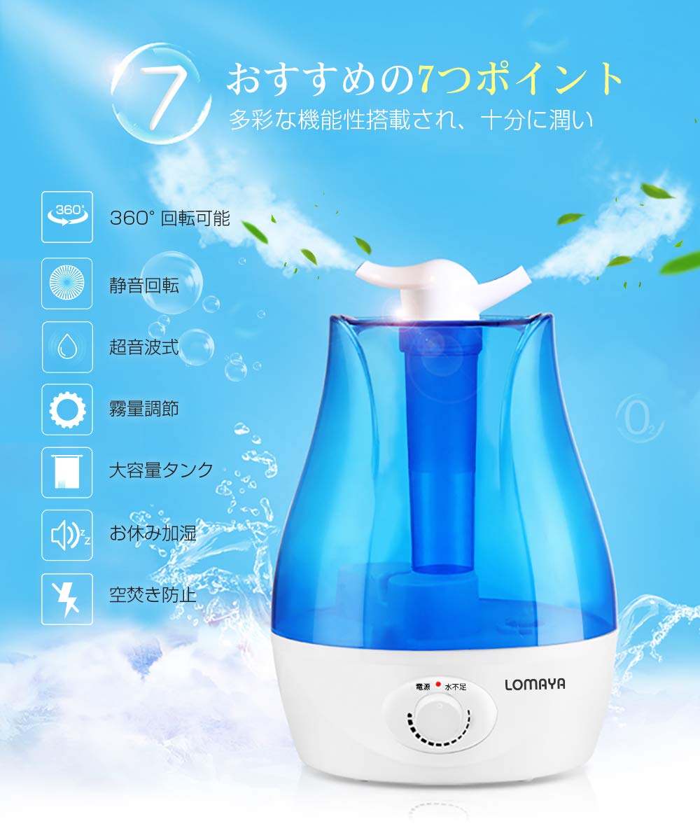 【安全性満点】自動停止機能、加湿器には自動停止機能が搭載されているので空焚の心配もなく、就寝時などの長時間使用にも安心ご利用いただけます。また、 水タンクがブルー半透明なので、水の量が一目で分かって便利です。子供やお年寄りがいる家庭にもピッタリ。