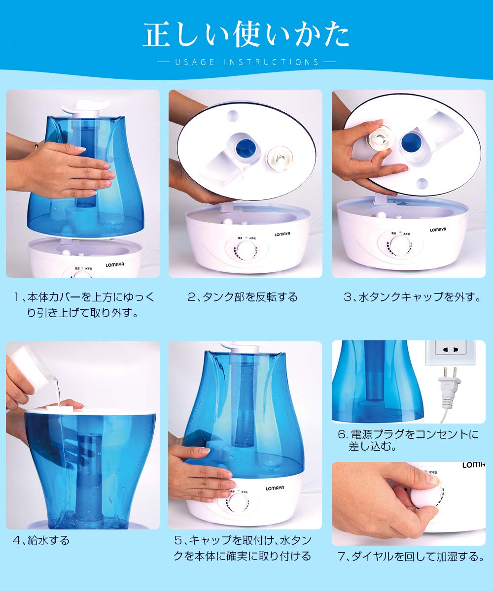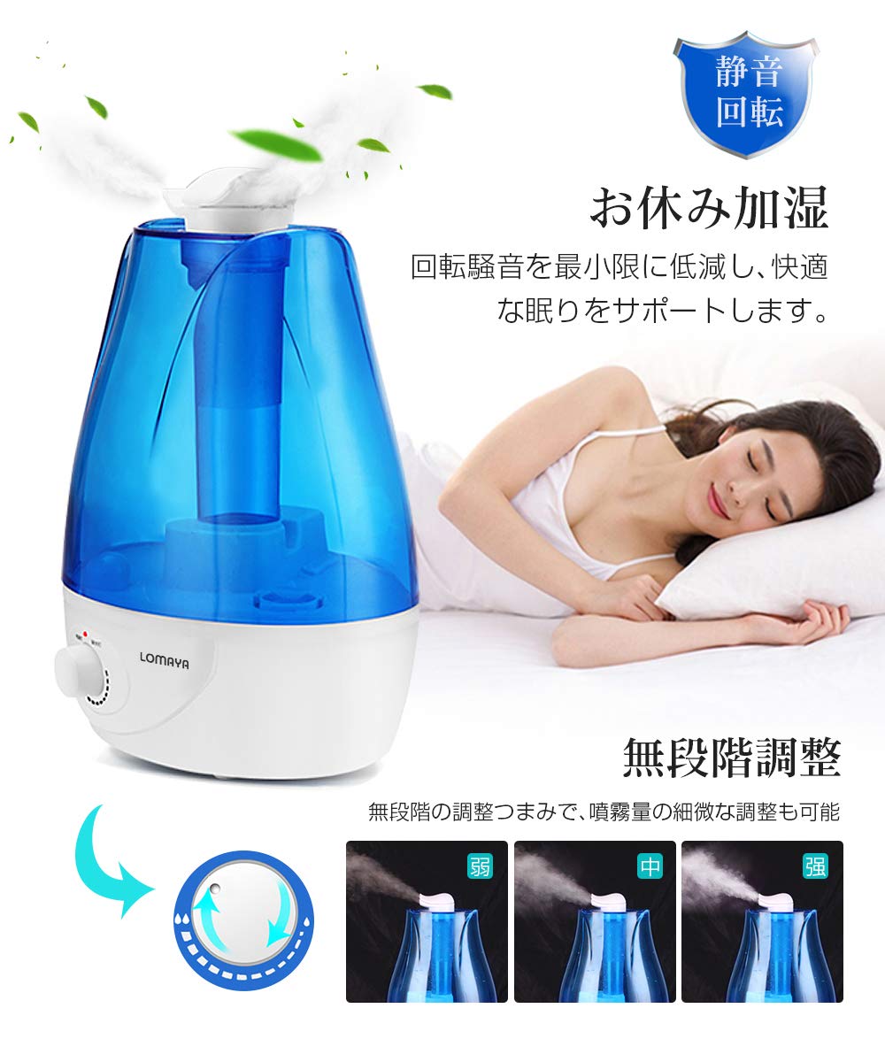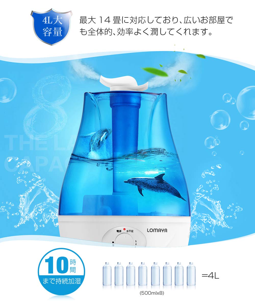 【安全性満点】自動停止機能、加湿器には自動停止機能が搭載されているので空焚の心配もなく、就寝時などの長時間使用にも安心ご利用いただけます。また、 水タンクがブルー半透明なので、水の量が一目で分かって便利です。子供やお年寄りがいる家庭にもピッタリ。