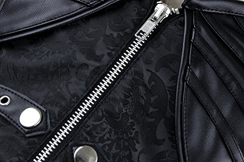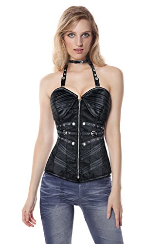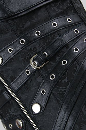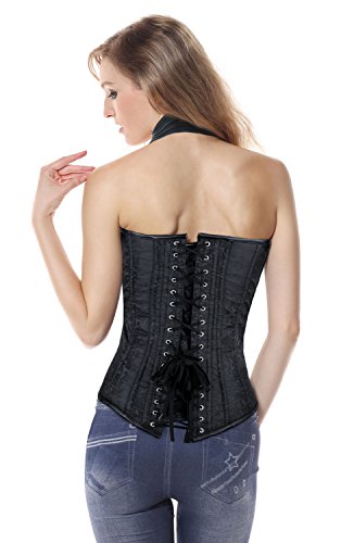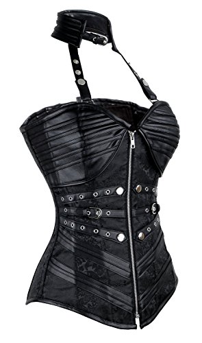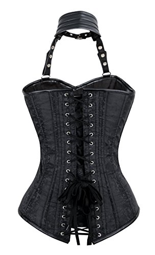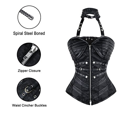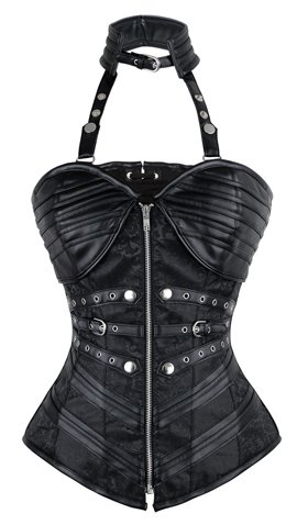 Binding : Apparel Product Description Women's steampunk black outerwear corset, with spiral steel boned, halter neck with adjustable buckles closure, used high quality jacquard and faux leather fabric, bust with cross grain details, waist cincher buckles and zipper closure in front, lace-up in back for cinching, g-string not include.
