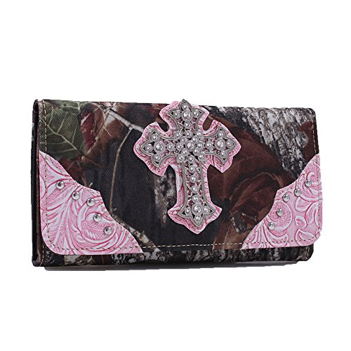Emperia Women's Ashley Mossy Oak Cross Tri-Folded Wallet with Rhinestones, Camouflage/Pink Trim, 7.5 x 1 x 4.5-Inch