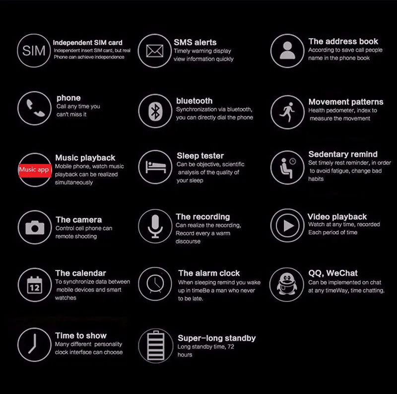 Function:Noctilucent,Passometer,World Time,Mood Tracker,Sleep Tracker,Calendar,Dial Call,Push Message,Alarm Clock,24 hour instruction,Answer Call,Message Reminder,Lighting,Interactive Music,Call Reminder