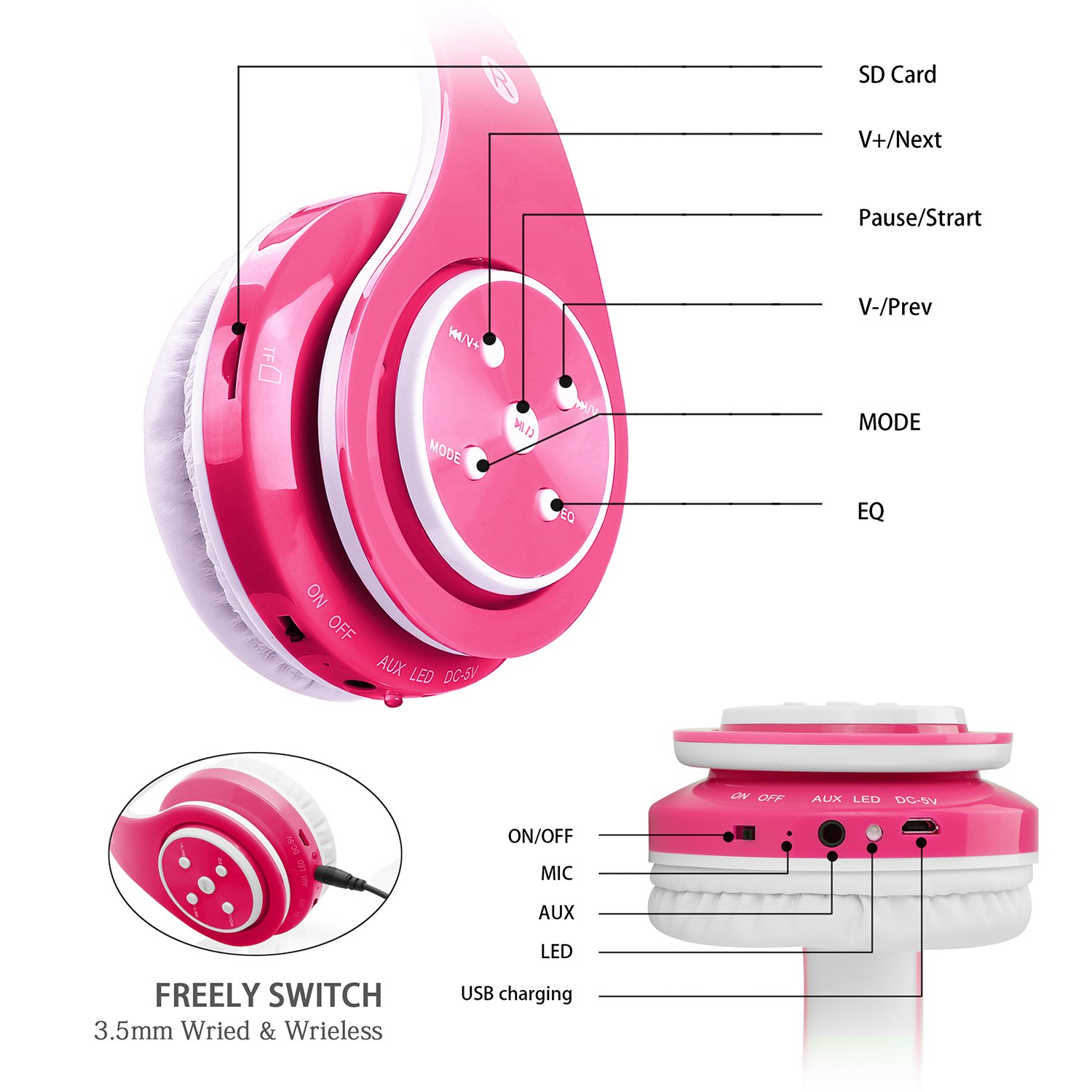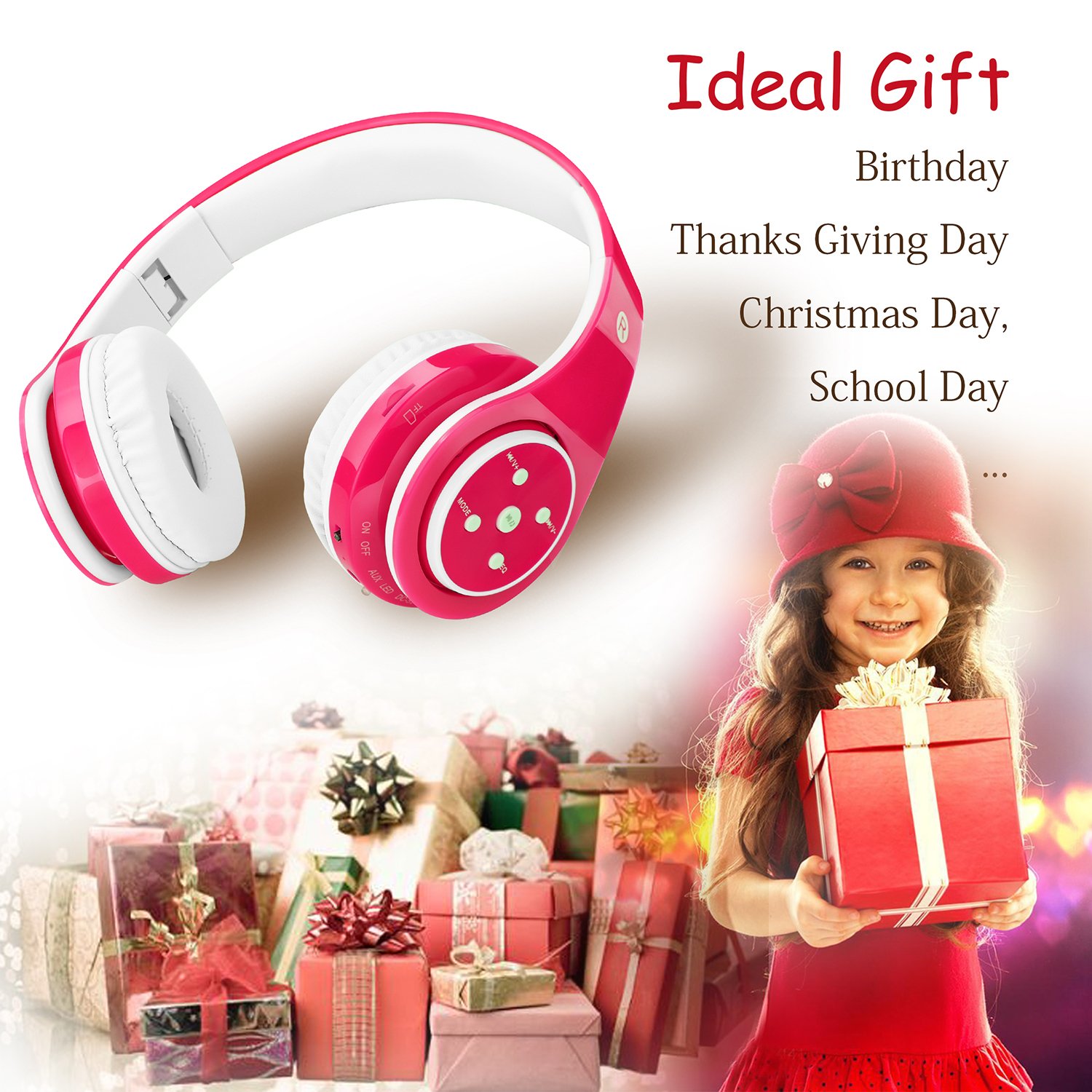 LED indicator light, infant bluetooth headphones with microphone, play / pause, answer with one button / hang up.
