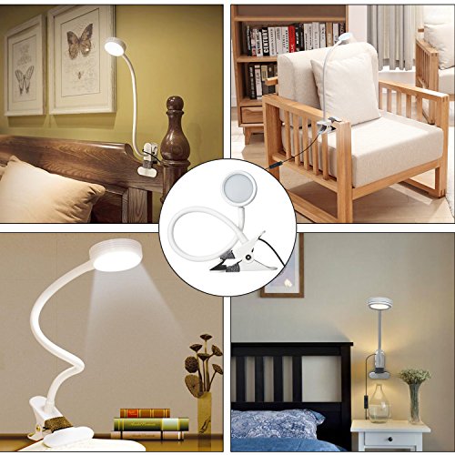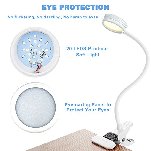 - EYE PROTECTION:Our eye-care bedside reading light made of 20pcs LED bulbs produce soft light, no flickering, no dazzling, no harsh to eyes, no-radiation.What a great table lamp for reading on bed or desk.