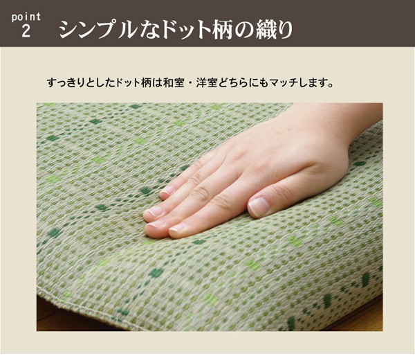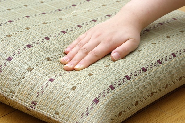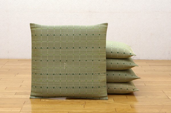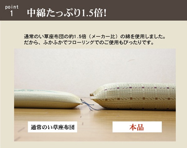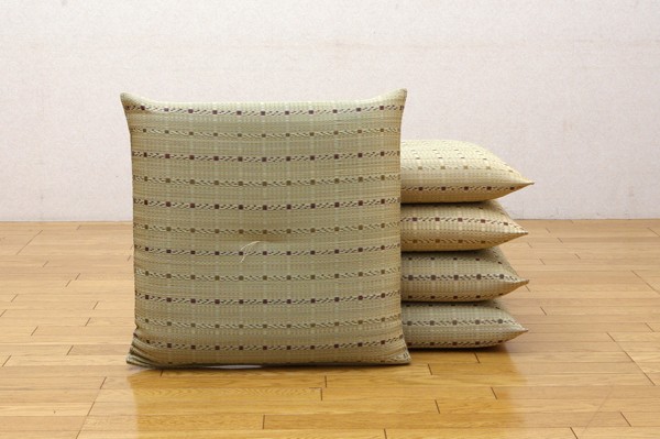 和モダンなテイストの格子柄い草座布団です。中材にはメーカー比1.5倍の量のわたを使用しています。ふっくらフカフカとしたボリューム感をお楽しみ下さい。生地は一般的な敷き物と同じようにイ草を織込み、しっかりとした生地に仕上げました。国産(九州産)のい草を使用しています。一本一本が太く、表皮が厚く繊維がキメ細かいので弾力性があり、耐久性に優れています。い草には空気の自然浄化作用、湿度の調節作用などがあります。また汚れにくく、使用するうちに黄金色に変化し味が出ます。い草に青森ヒバ加工を施しています(抗菌、防臭効果)。