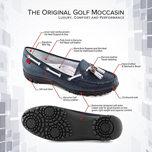 Binding : Apparel Product Description Renown for our Luxury driving moccasins Loafers this is a marriage of our expertise in the complex manufacturing technique of moccasins with a full line of Golf shoes. They consist of identical hand stitching technology used in our Moccasins... but now on a stylish Golf shoe! An articulate exclusive designed soft spike rubber injected sole, developed for good traction on the green. Light weight superior comfort for versatile use on and off the course. The contrast tassel along with embossed pebble leather upper adds elegance sophistication. 0