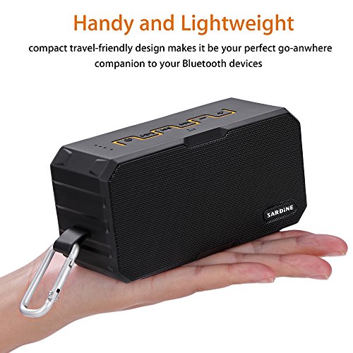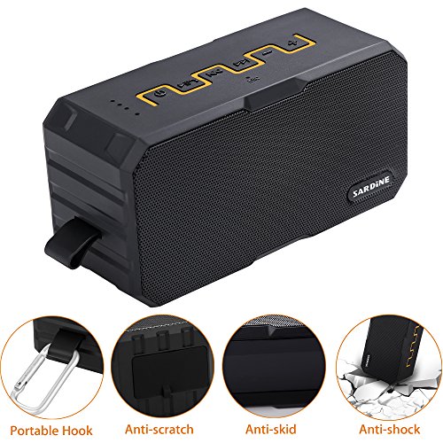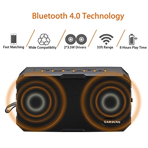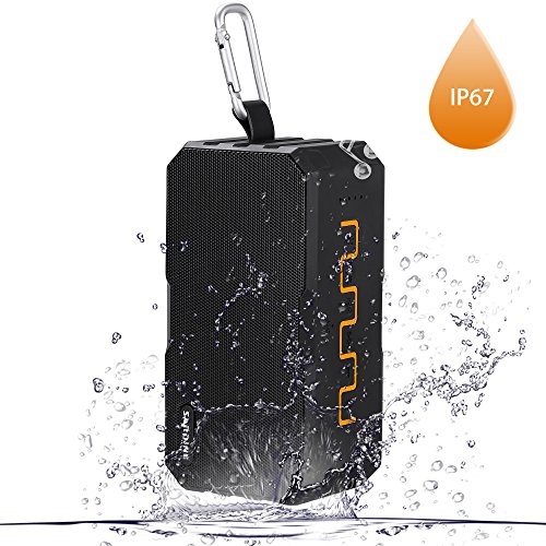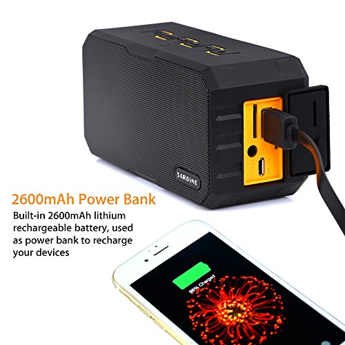 -. Feature : 【High Audio Technology】Performed by 2 x 3.5W speakers for a balanced, clean and deep rich bass sound. Built-in microphone for hands-free speaker phone calling / 【Tough and Durable】Designed of IP67-rated waterproof and dust-tight, is safe to use in the shower, rain, fishing, traveling, hiking, running, camping, climbing and other outdoor activities / 【Power Bank Function】Built-in 2500mAh rechargeable lithium battery, allowing you to enjoy music up to 5 hours(Playtime varies according to volume level and audio content). Also with DC output so that you can connect a charge cable to recharge your phone, tablets or other devices / 【Handy and Lightweight】Its handy size, and with a hook which is a perfect option to take anywhere you wish, no matter outdoors or indoors / 【Warranty】Comes with 30-days money-back guarantee for any reason, 18-month warranty for any quality-related issues and 24-hours friendly customer service