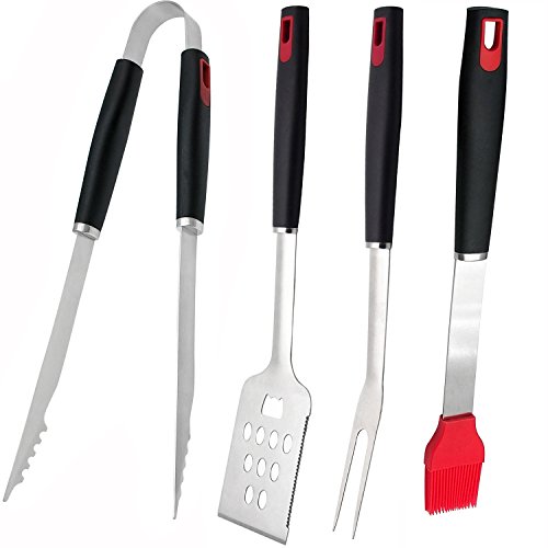 AUYE 4-Piece Grill Tools includes tongs, barbecue meat fork, silicone basting brush, and grilling spatula that features a bottle opener and serrated edge for tenderizing and cutting meat.