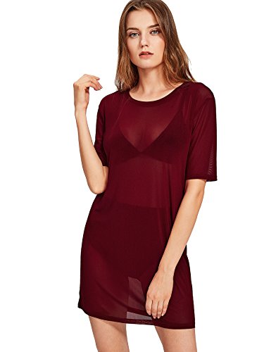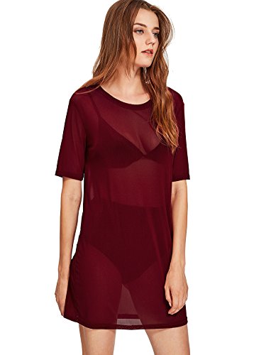 See through, short sleeve, solid color, round neck, t-shirt style short dress. Fabric has some stretch.