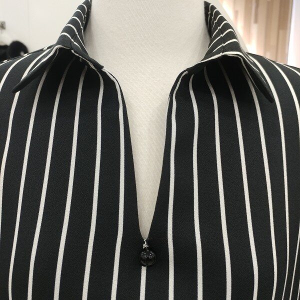 단정한 카라의 브이넥라인으로 갸름한 페이스를 느끼게 도와드리며