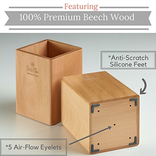 PortoFino Beech Wood Kitchen Utensil Holder / Wooden Cooking Tools Organizer / Storage Crock / Anti-Slip Silicone Feet 4.75 L x 4.75 W x 6.5 H (inches)