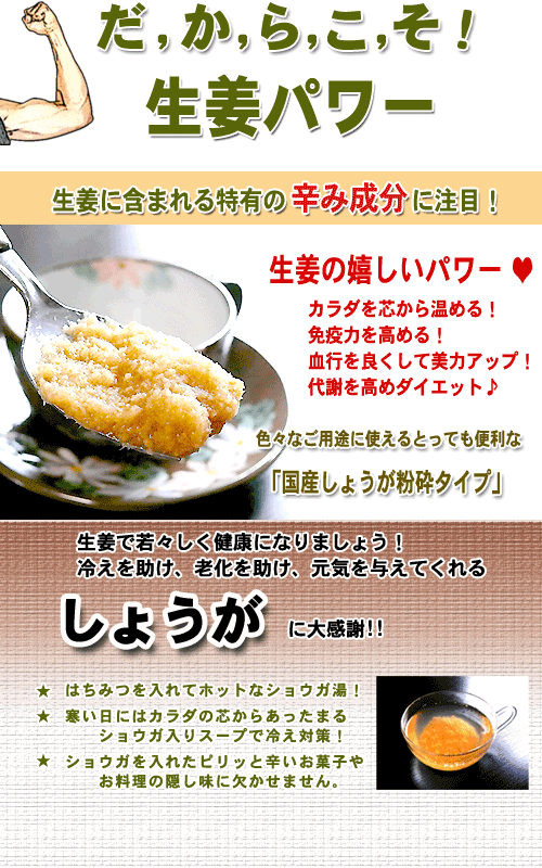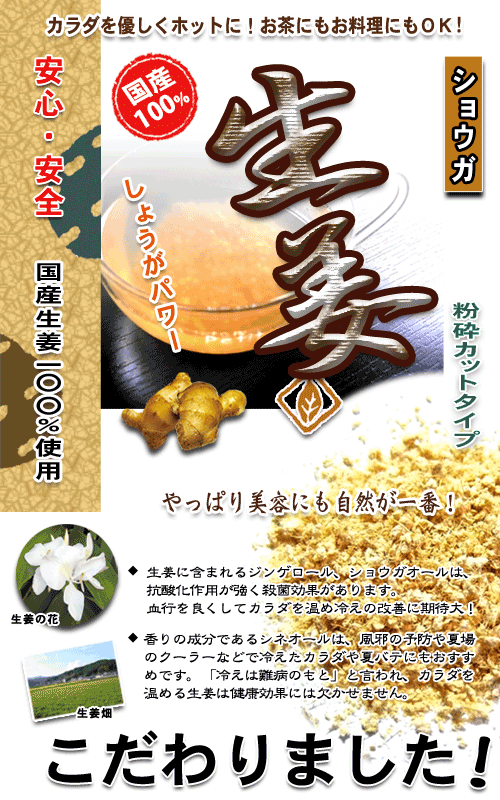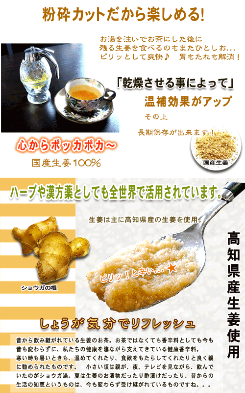 | kenkoucha 生姜は一般的に香辛料としての使われ方が多いのですが、生姜を加えたホットな葛湯は、カラダを温めてくれるため、冬場や寒くなる時に良く飲まれています。 ティーポットで抽出して、砂糖や蜂蜜を加えたストレートで、またはミルクティー、紅茶に加えたしょうが紅茶や 煮出しミルクティー(チャイ)にしても人気。> ・・飲み方・・・・・・・・・・・・・・・・・・・・・・・・・・ ティーカップ等に小さじ1杯程度を入れ熱湯を注いでお好みの濃さでいただきます。 葛を使ったしょうが湯(甘さは砂糖又は蜂蜜)等少し甘めにして飲んだり、その他色々なお料理に使ったり、沢山ご利用出来ます。 ・・備考・・・ 保存方法:開封前 直射日光、高温多湿を避ける開封後密封、低湿度 |