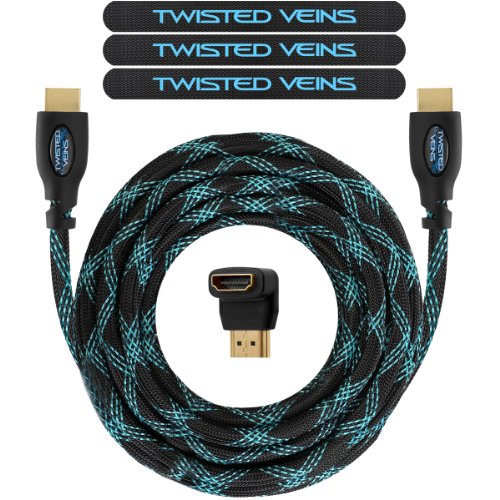 Twisted Veins 50’ High Speed HDMI Cable + Right Angle Adapter and Three Micro Velcro Cable Ties (Latest Version Supports Ethernet and Audio Return)